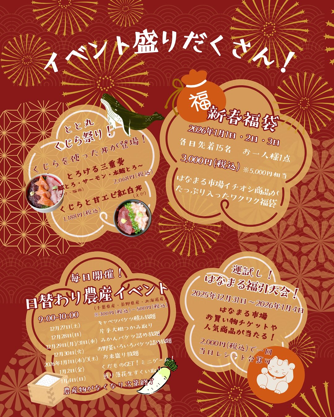 はなまる市場では、 2025年12月27日(土)から2026年1月4日(日)の期間、 年末年始大感謝祭  〜2026年もはなまるな一年になりますように祭〜🐴🐴🐴 を開催いたします🌅 期間中、日替わり農産イベントや、福袋の販売、特売品販売、 限定くじら丼の登場、お買い物の締めに運試し!はなまる福引大会 などなど… わくわくニコニコ企画盛りだくさんです🗻 2025年の締めくくりと、2026年のスタートは ぜひはなまる市場でお過ごしください👏🏻 ※公式Facebookより引用