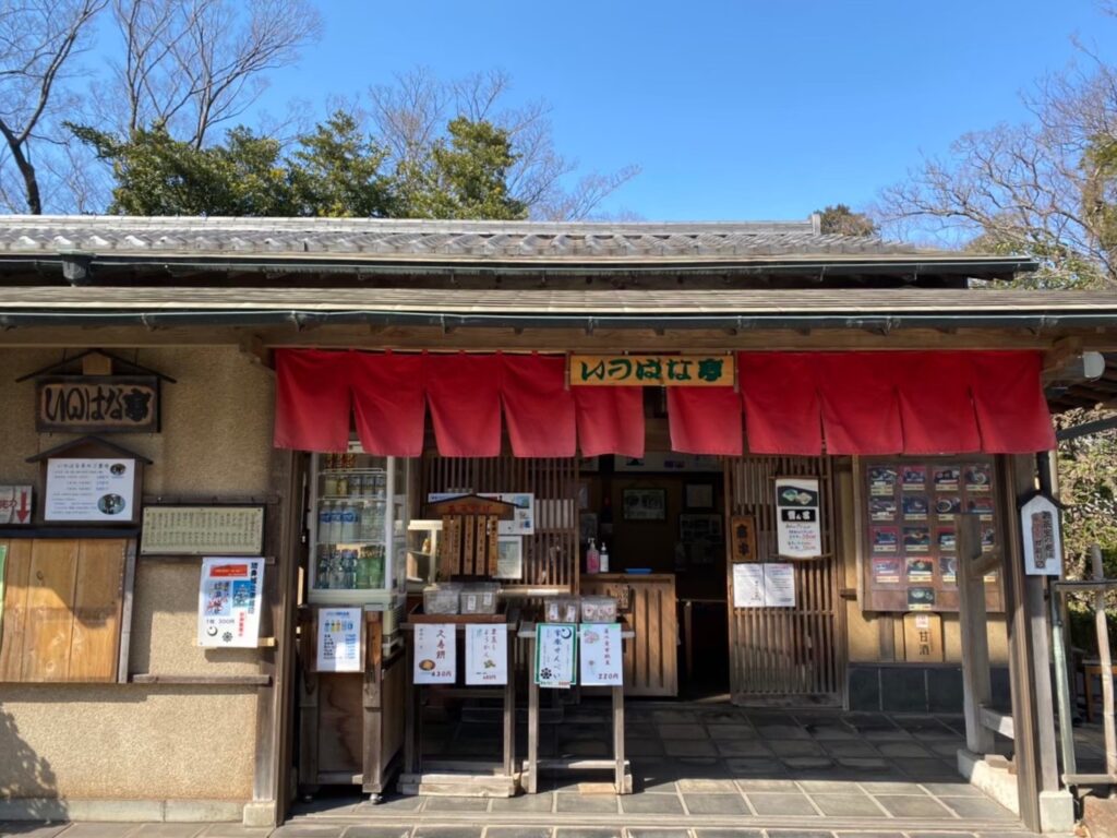 少し歩き疲れたら「いのはな亭」へ。周辺には日本庭園があり、紅梅をはじめとした椿や萩など四季折々の植物が楽しめます。