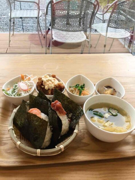 おにぎり御膳【おにぎり2個1,100円/3個1,300円】は、小鉢4種とお味噌汁、ドリンクとボリューム満点!