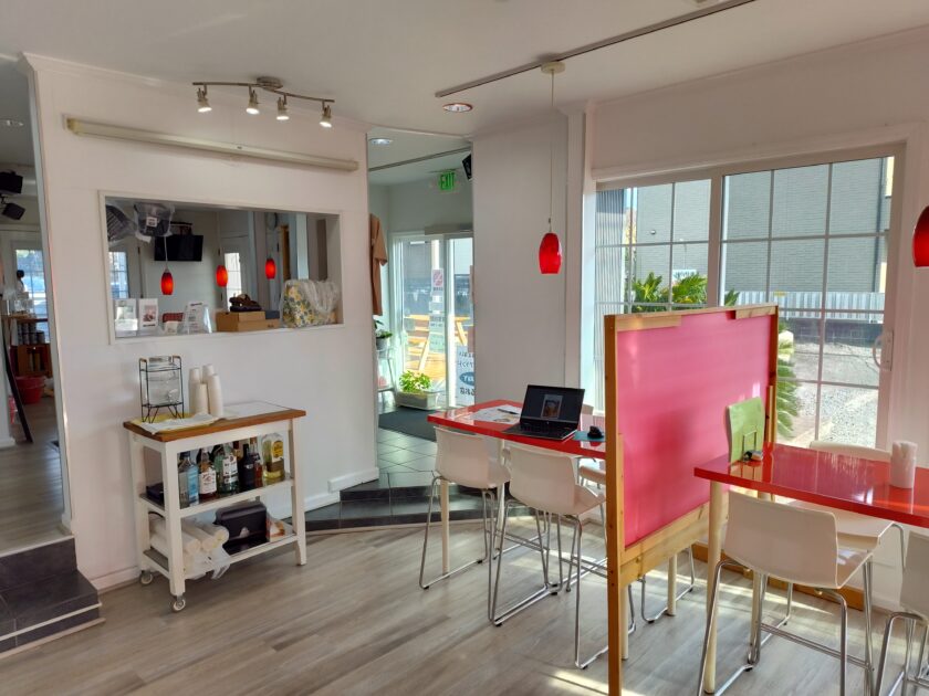 店内は白と赤を基調とし、明るくポップな空間が広がっています。
