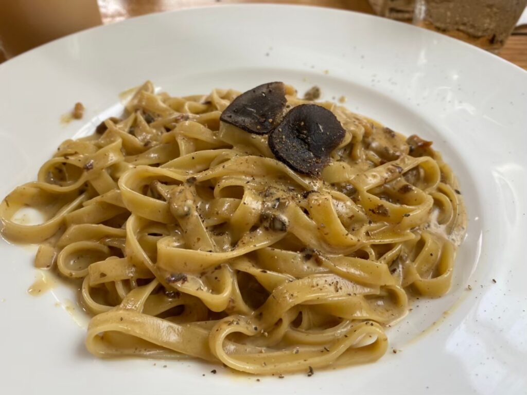 生麺のフェットチーネは数十種類のデュラムセモリナ粉と名水でこねた、こだわりのもちもち生パスタ。濃厚なクリームソースとよく絡み、トリュフとポルチーニの芳醇な香りが鼻を抜ける癖になる味付けです。