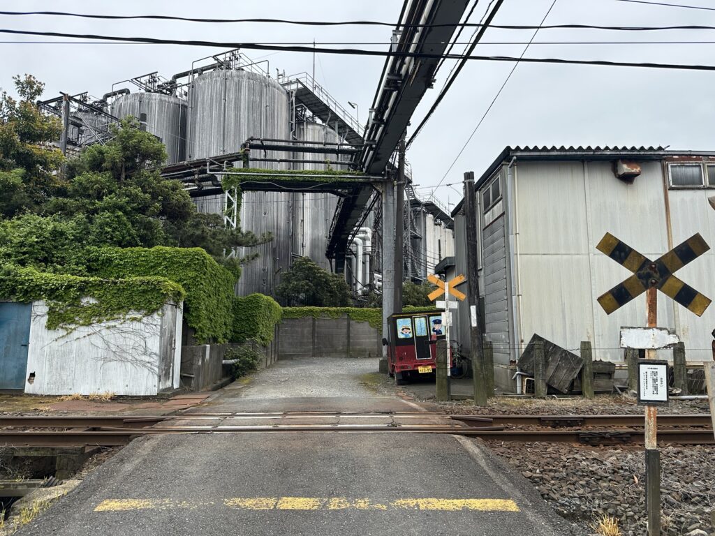 踏切の奥、ひと際存在感を放つのはヤマサ醤油工場の一部。
