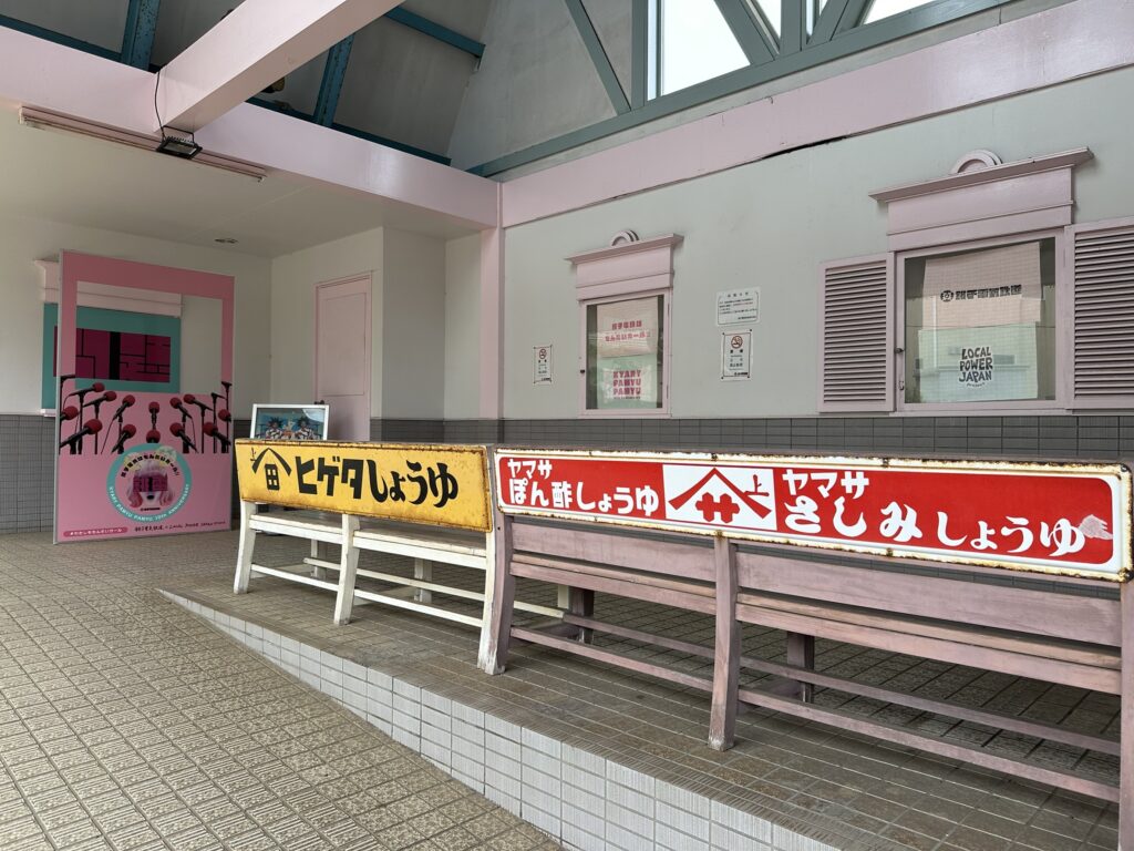 銚子電鉄とコラボした「岩下の新生姜」などの展示品が飾られておりインパクト大。