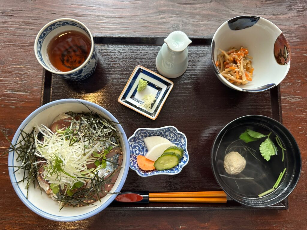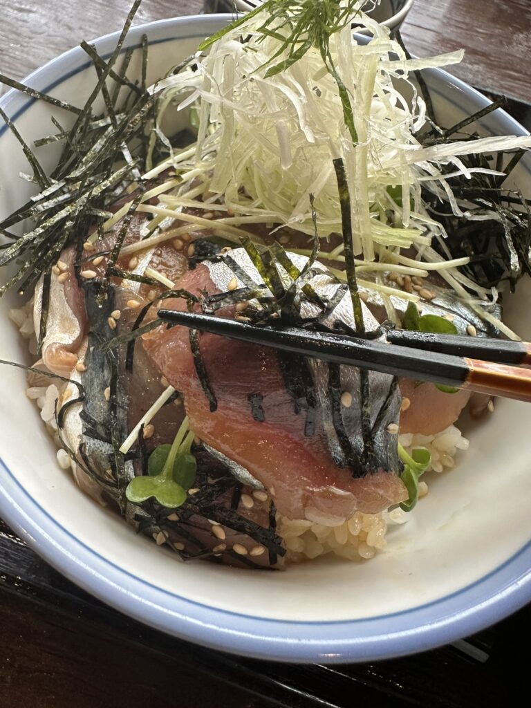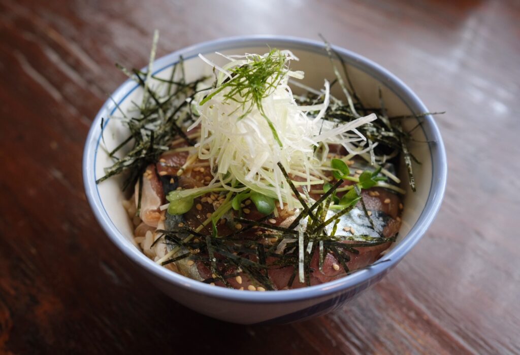 丼は一見小ぶりかと思いきや、中からサバがどんどん出てきます。白髪ねぎやカイワレ大根、海苔、ワサビなどの薬味がいい味変になります。