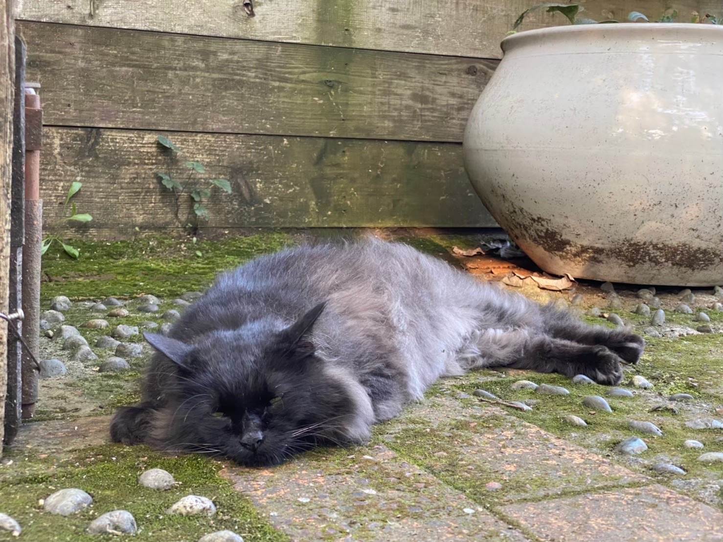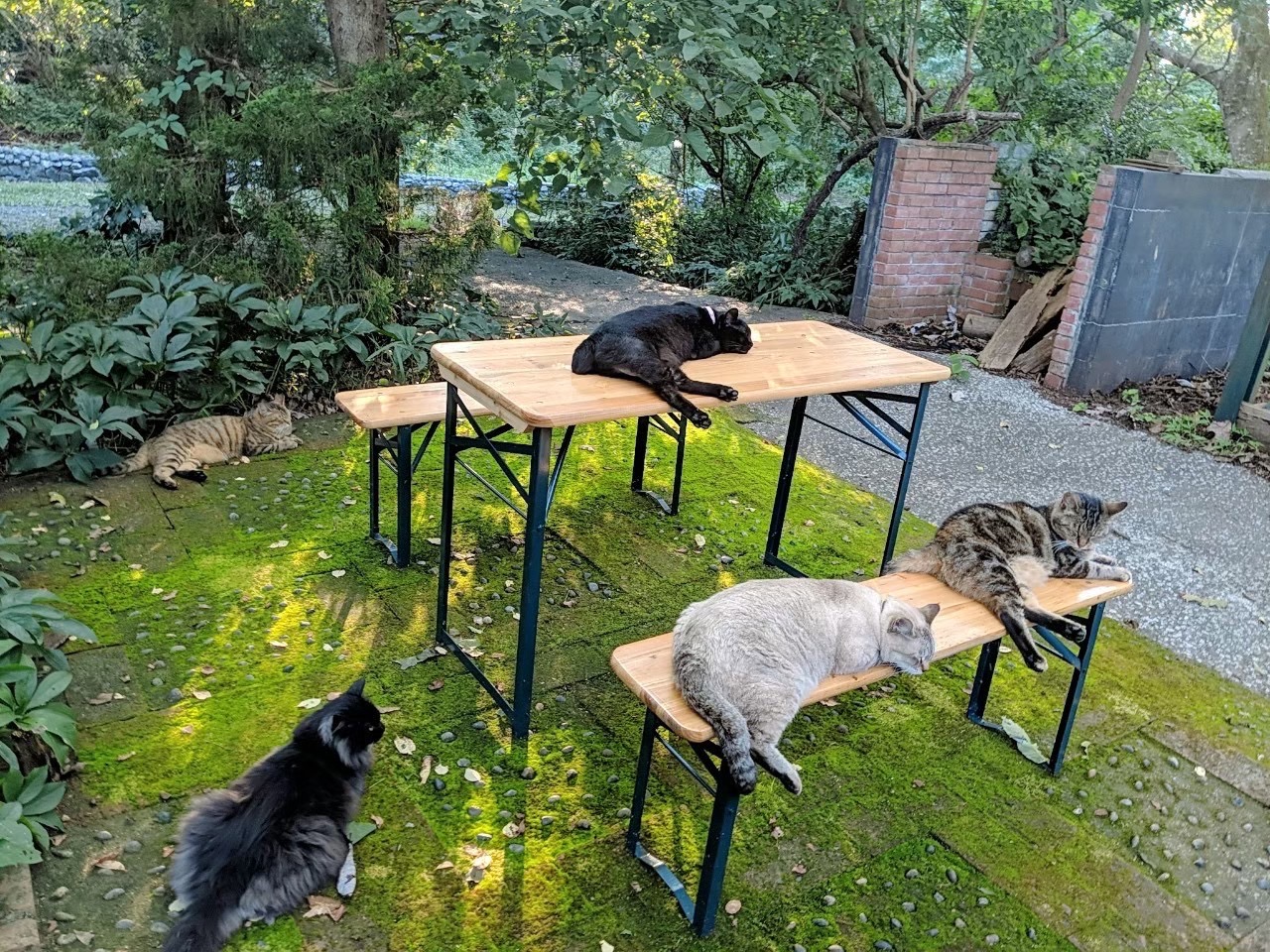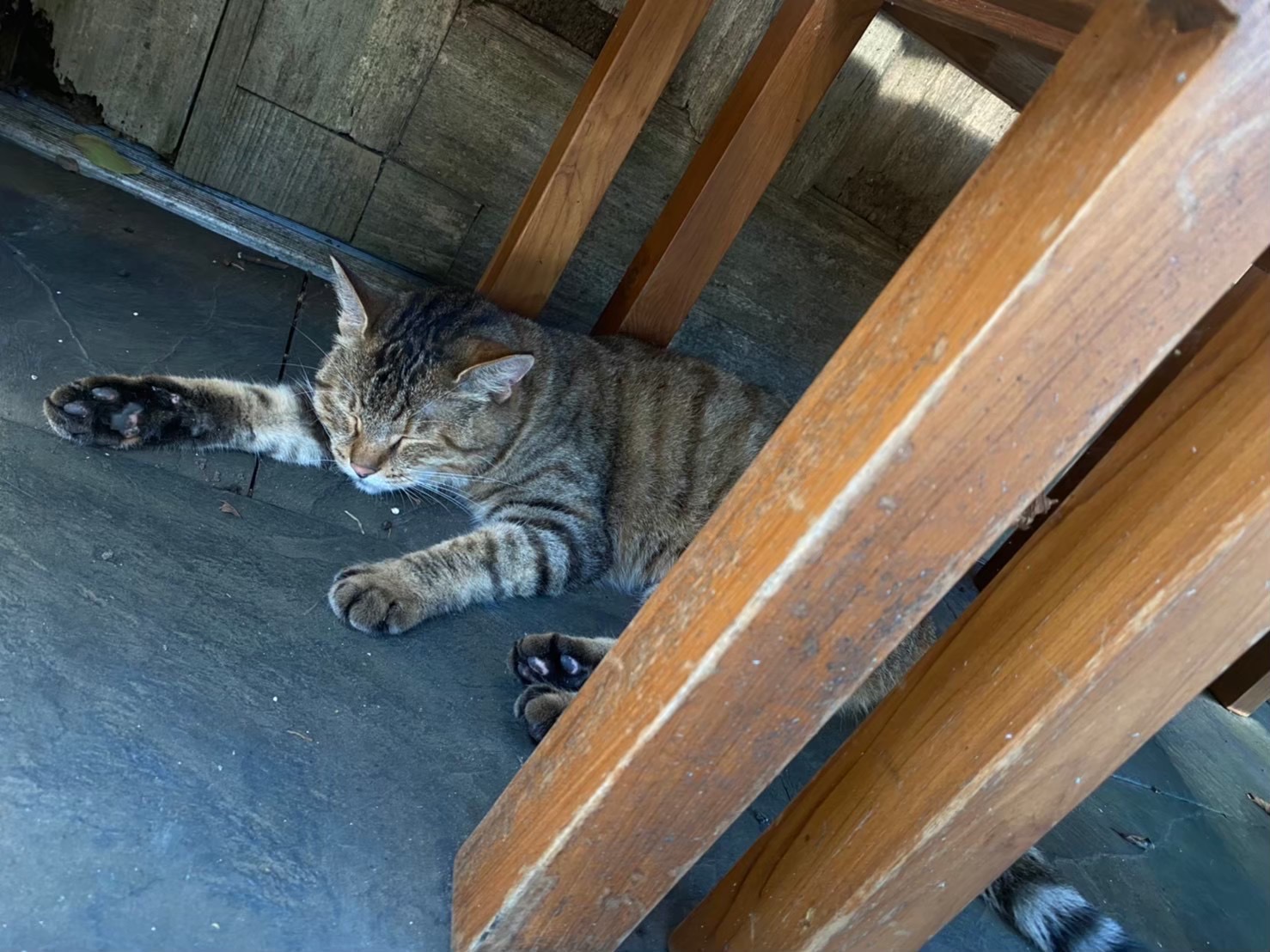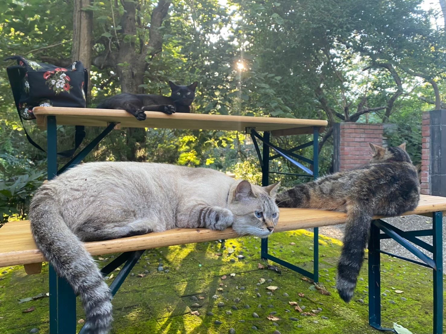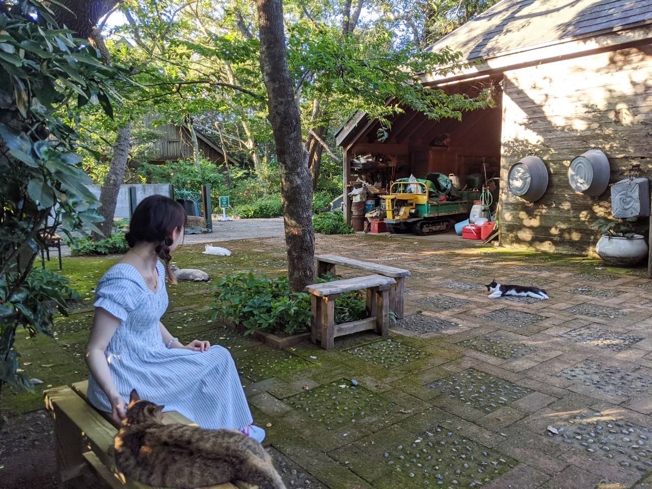 お庭を歩いていると、ふらりと現れるのが、のんびりとくつろぐ気ままな猫たち。