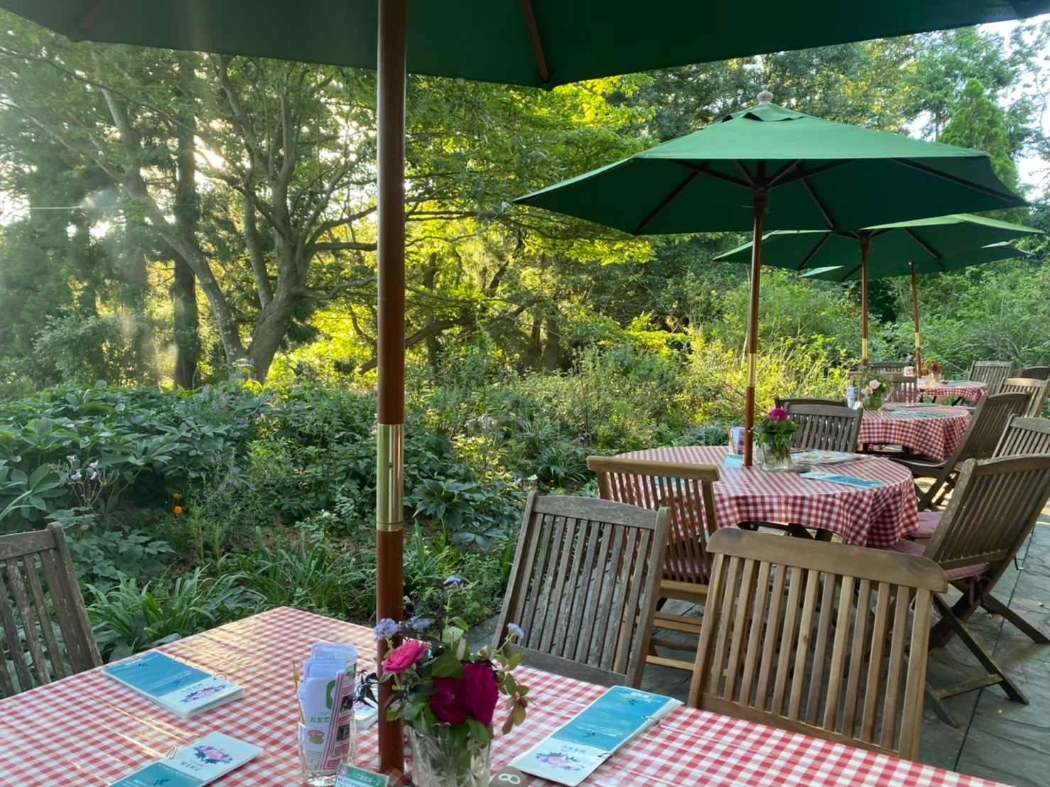 屋内席も快適ですが、夏のドリプレを味わうなら、風と緑に包まれるテラスでのティータイムをぜひ体験してみてください。