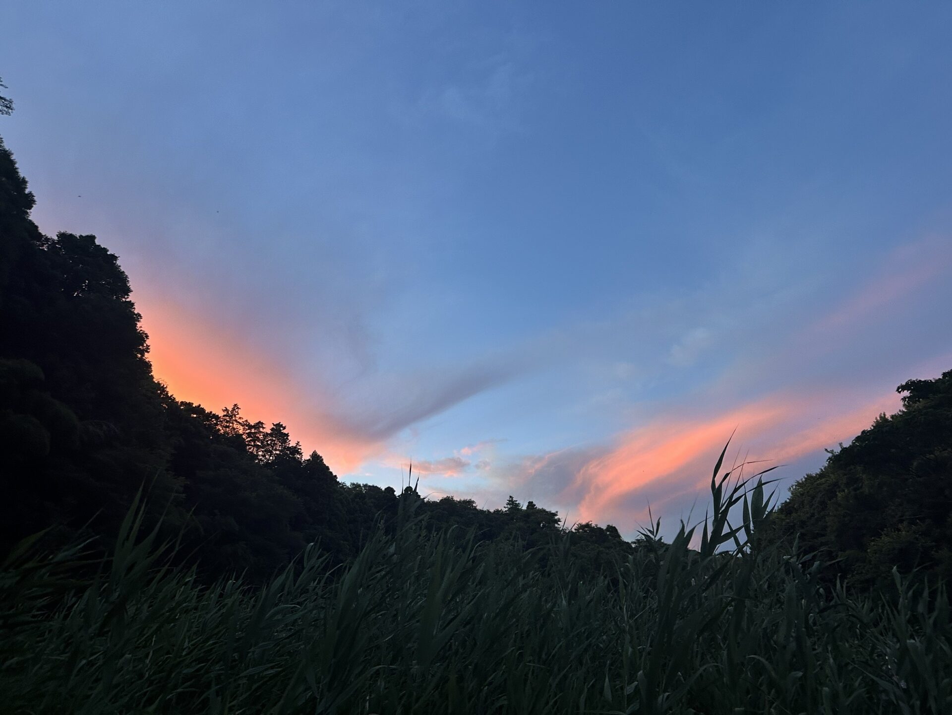 夕日が空を染め、暮れてきたらいよいよホタルが出始めます。