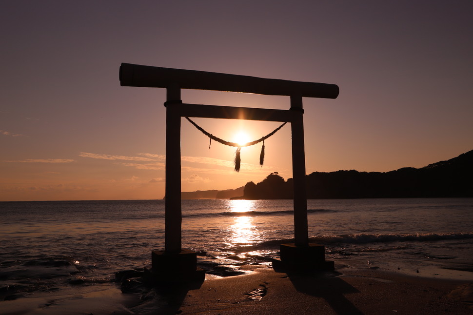 鵜原理想郷からすぐ下に降りると、夕日スポット「八坂神社 一の鳥居」があります。