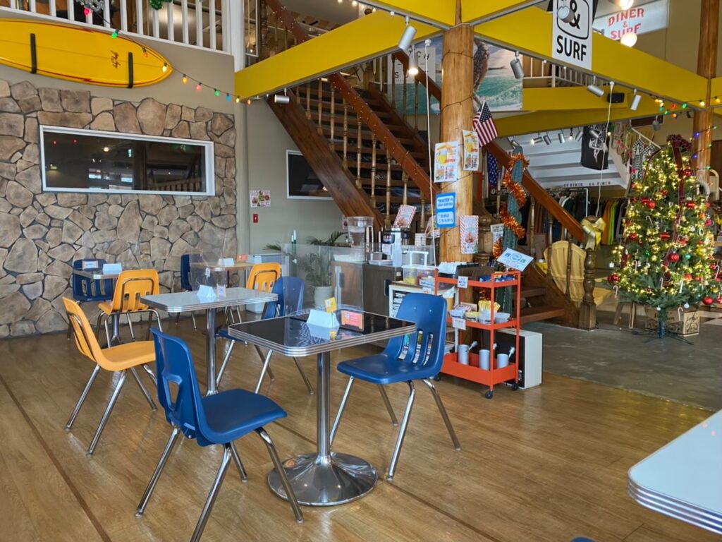 また九十九里といえばサーファーの聖地!E.G.DINERは九十九里浜からも近く、1Fはアメリカンダイナー、スケートパーク、2Fはサーフショップを併設しています。