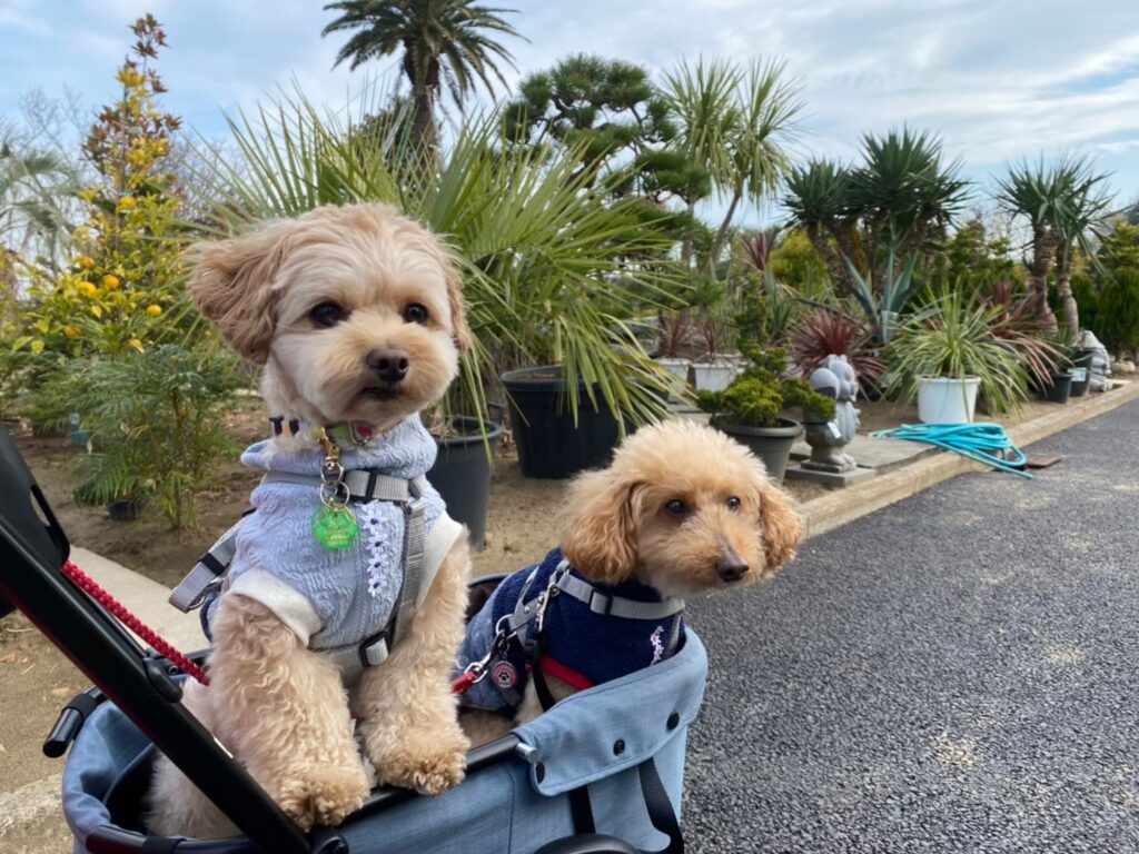 敷地内では、わんちゃんはカートか抱っこなら同伴可能。