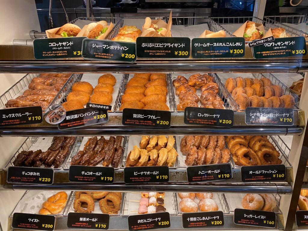 甘いものから食事まで、ショーケースにはたくさんのドーナツが並べられています。