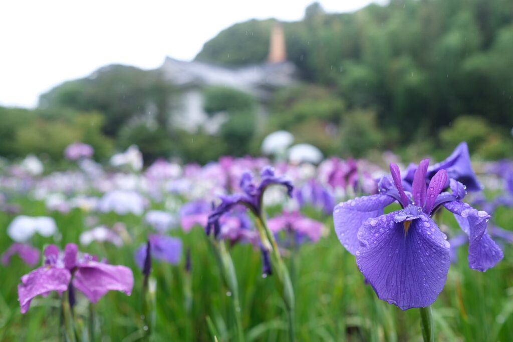 像師堂からぐるっと周ると見えてくる花菖蒲園は、6月上旬から見頃を迎え、約5,000本以上の花菖蒲が咲き誇ります。