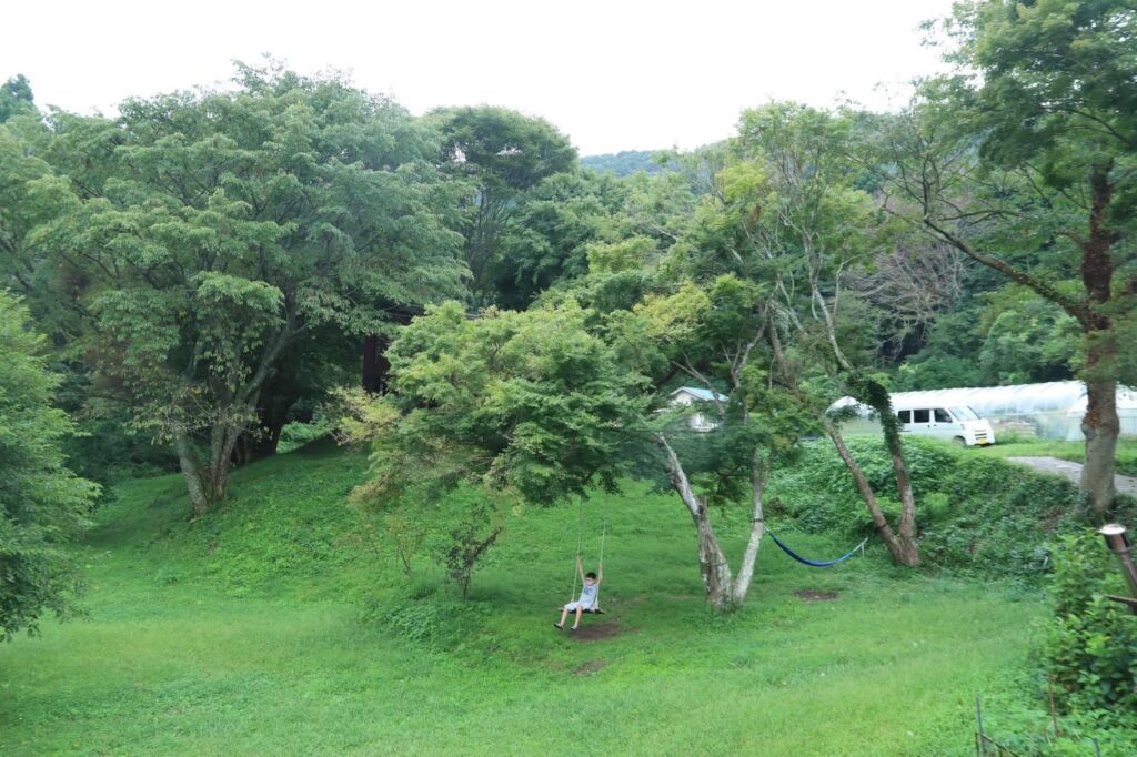 庭には手作りのブランコもあり、お子さまや大人も一緒に遊びながら、自然の中でリラックスできる空間が作られています。