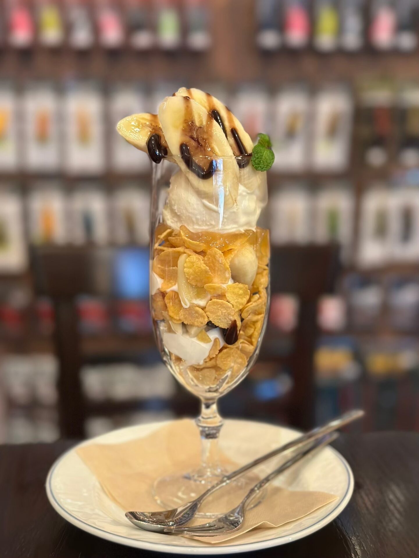 チョコバナナサンデーは、濃厚なチョコレートソースと完熟のバナナが絶妙。サクサクのトッピングがアクセントになり、一口ごとに満足感が広がります。