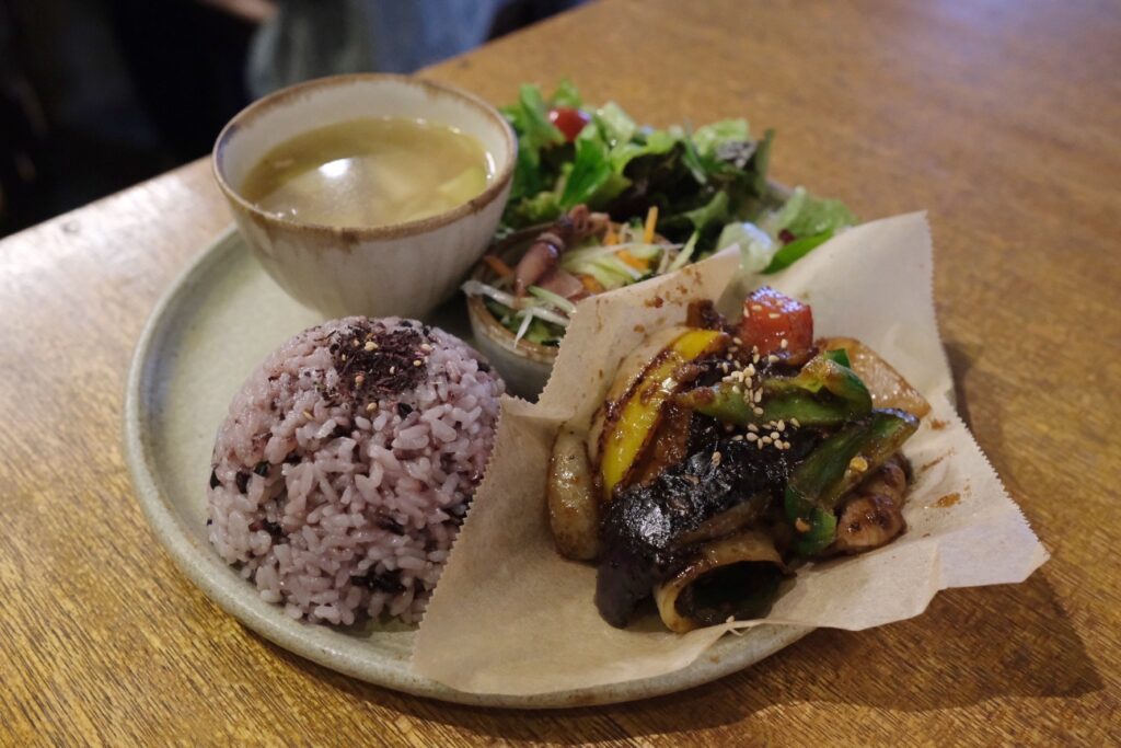 黒米ごはんを囲むのは、茄子とピーマンと豚バラ肉の自家製ピリ辛味噌炒め、ホタルいかと胡瓜のナムル、みりん塩糀ドレッシングのサラダ、具沢山のコンソメスープ。