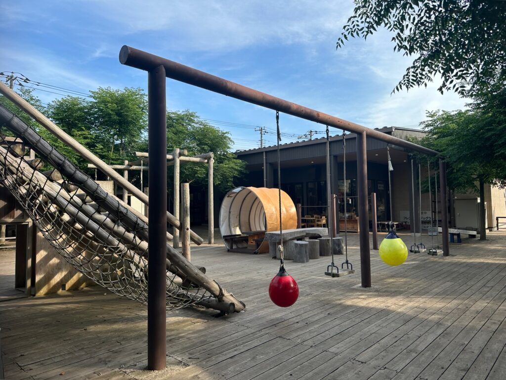 例えば、木製のアスレチックや隠れ家など、冒険心をくすぐるアクティビティが揃っています。