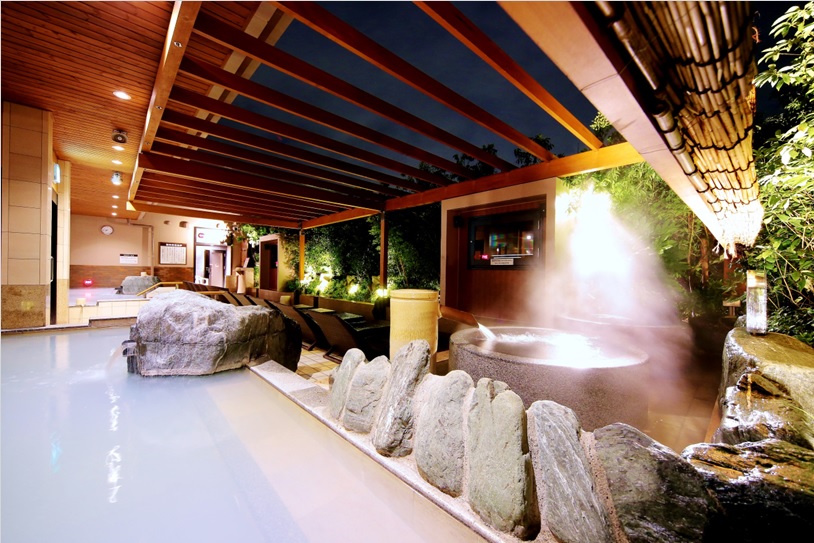 外気浴スペースには、地下2,000mからくみ上げた温泉を使用した露天風呂も完備。