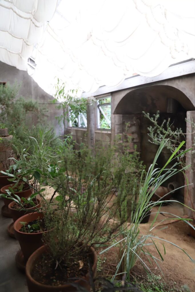階段下には、まるで森の中の秘密の庭に迷い込んだかのようなハーブ園が見られます。