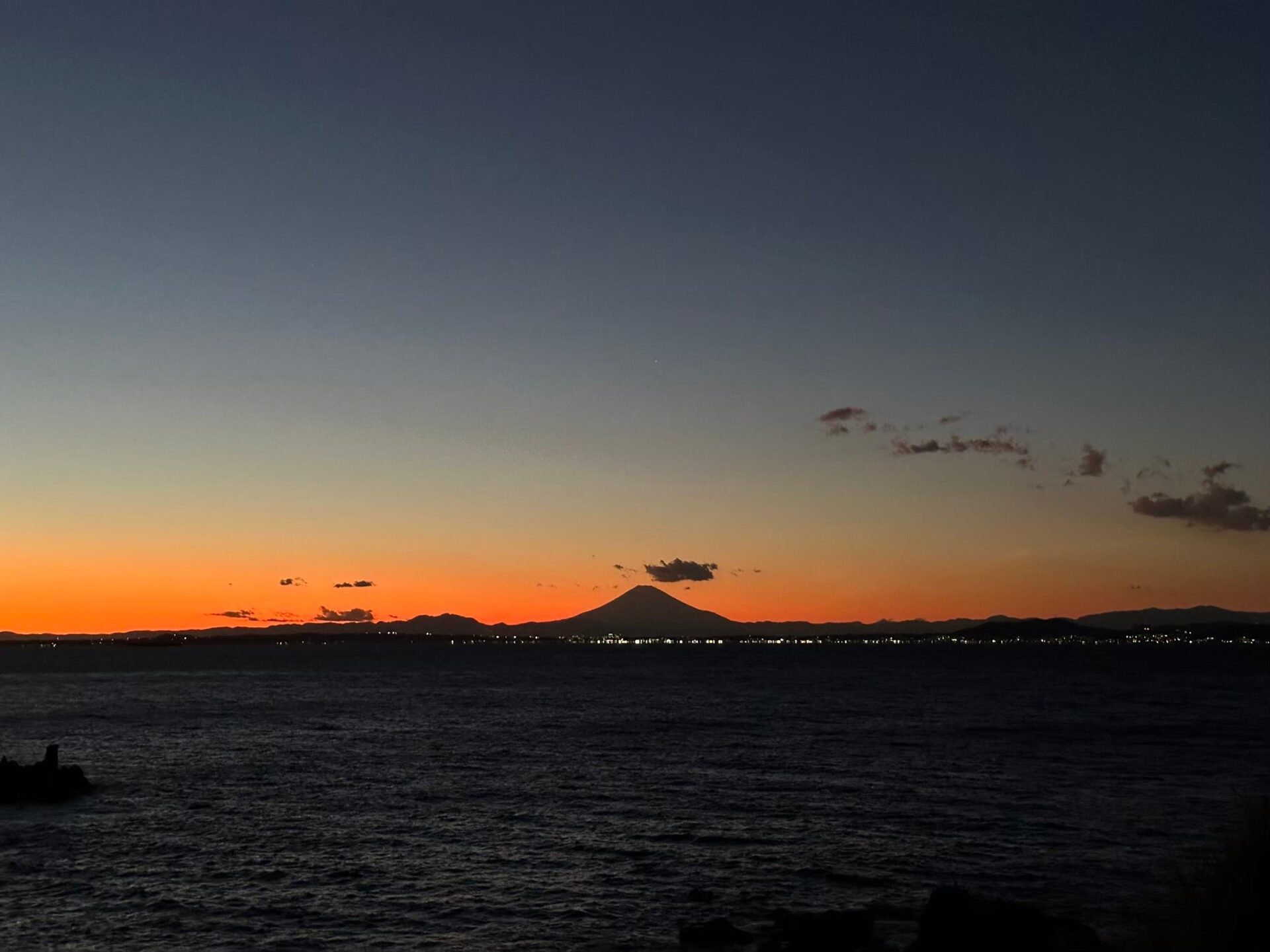 日が沈む西の空にシルエットで浮かび上がるのは、遠く離れた富士の山影。