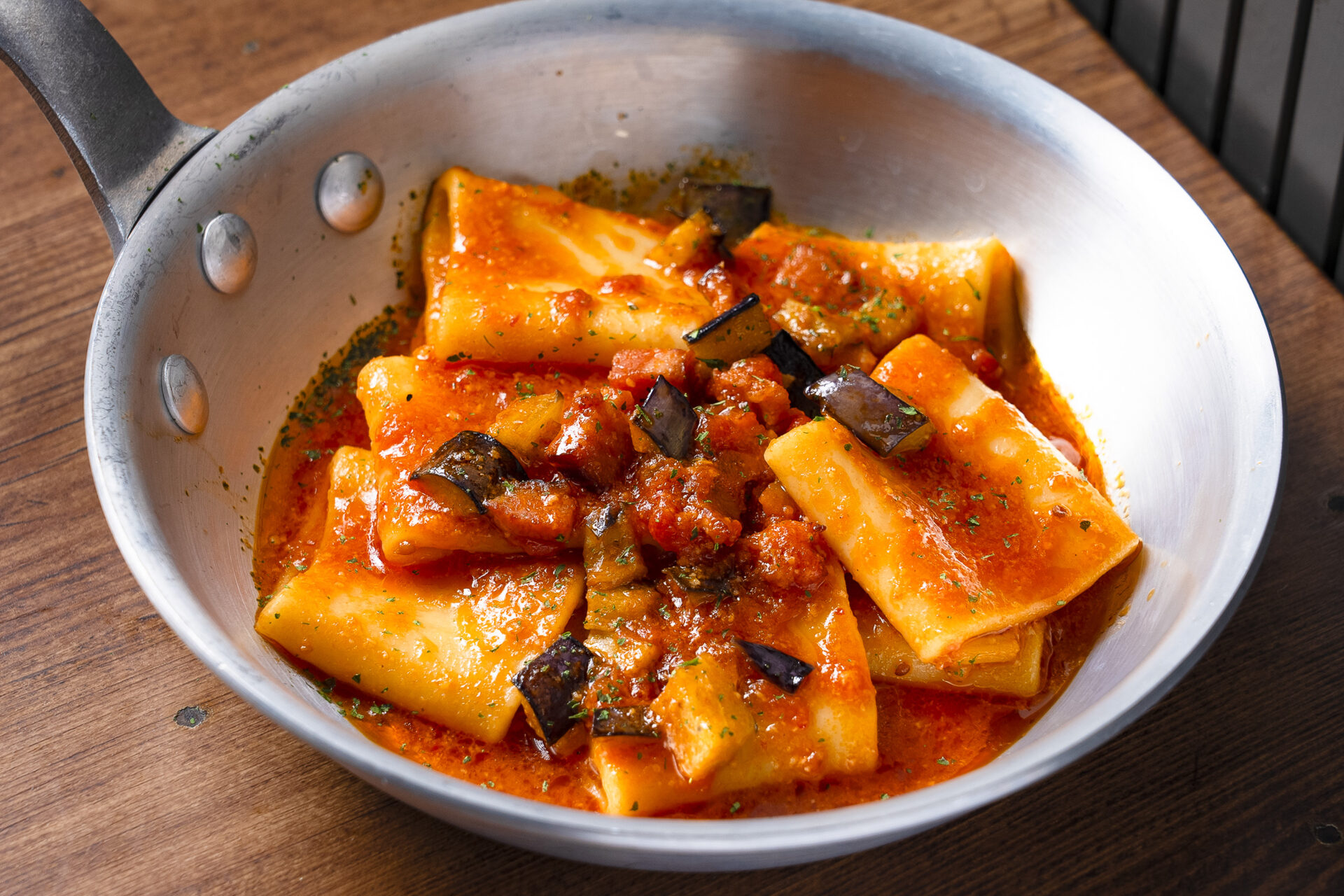 「茄子とベーコンのパッケリ・アラビアータ」は、大きなパスタにピリッと辛みの効いたソースが絡み、ベーコンの旨みと茄子のとろりとした食感がアクセント。見た目にも満足感あるひと皿です。