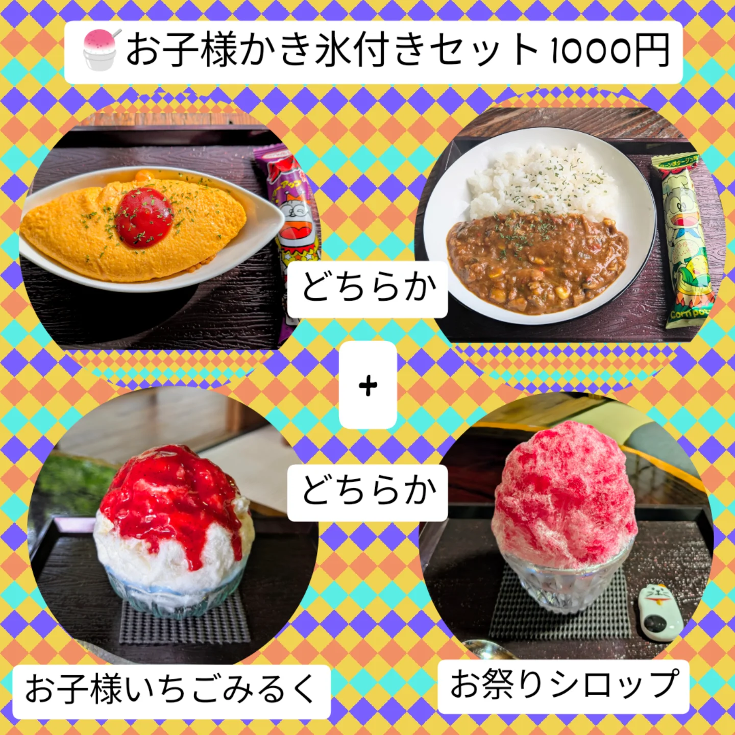 オムライス又はカレーに、「お子様いちごみるく」か「お祭りシロップ」のどちらか好きなかき氷がセットになっています。