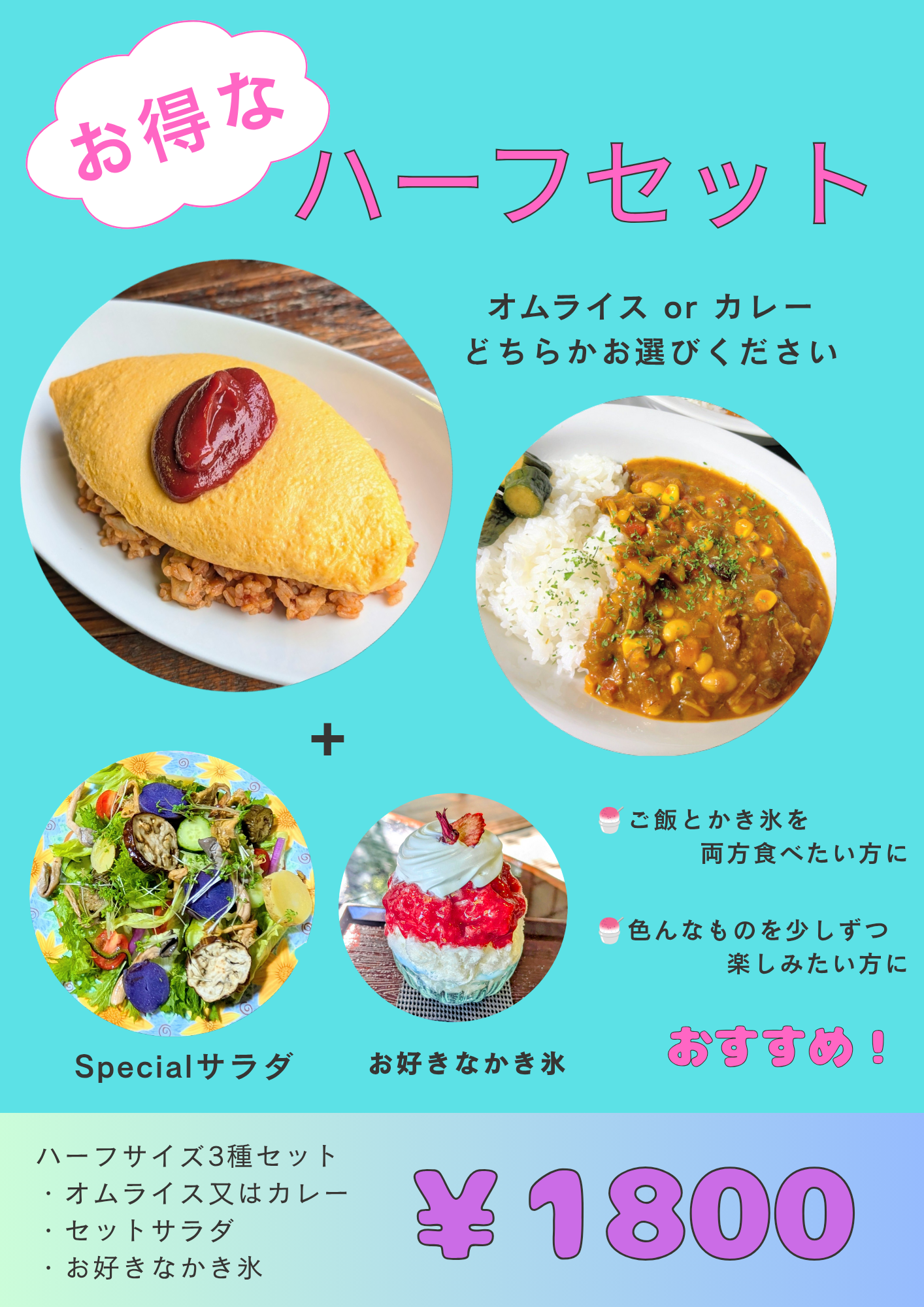 ランチもかき氷も両方食べたい!という人には、「お得なハーフセット」1,800円がおすすめ。