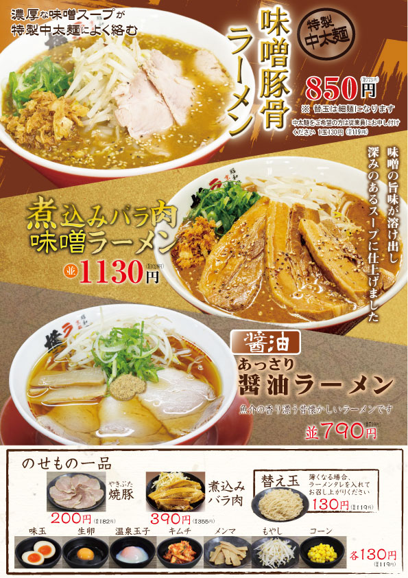 メニューは、創業当初から愛され続ける豚骨しょうゆラーメンを中心に、世代問わず満足できるラインナップが揃っています。