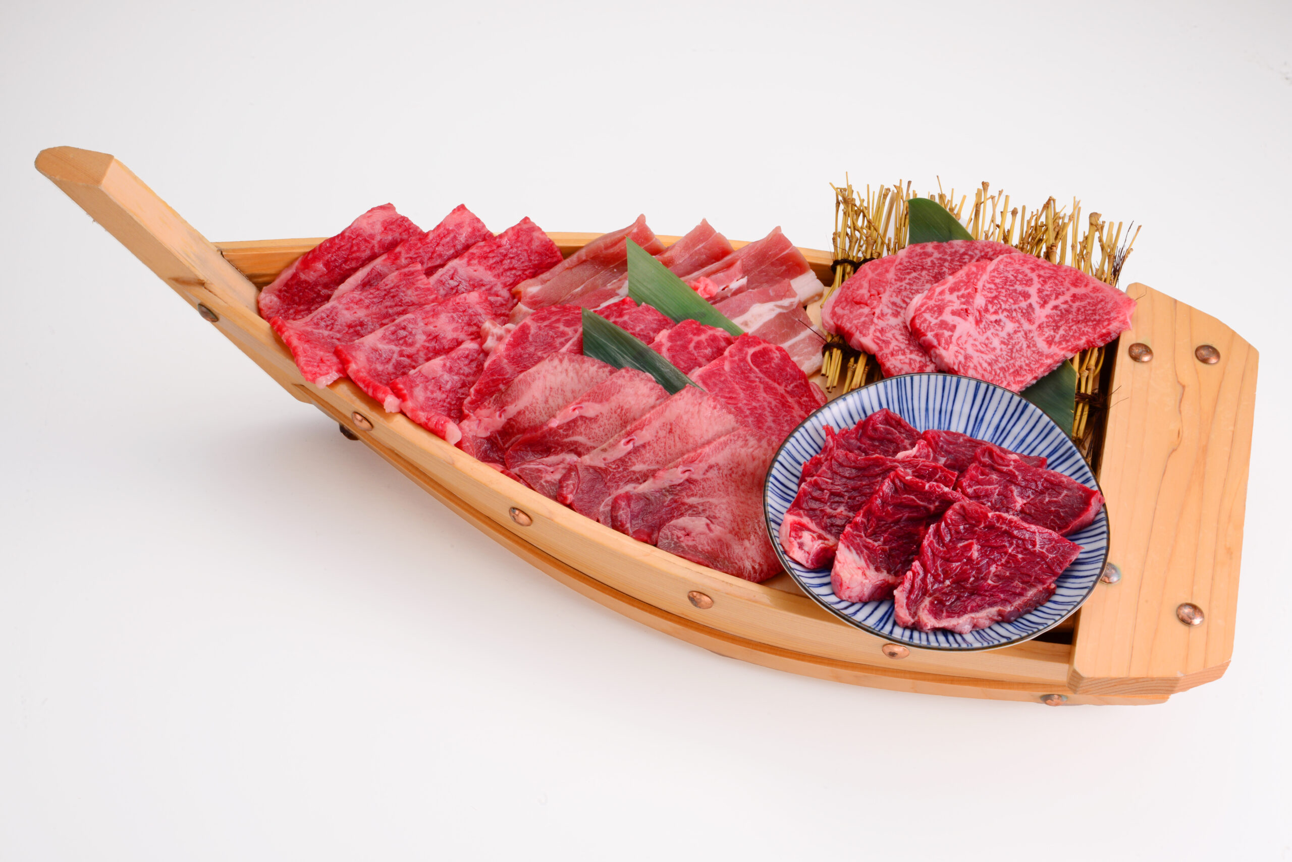 舟の上には、大和ビーフを中心とした上質なお肉が豪快に盛り付けられ、