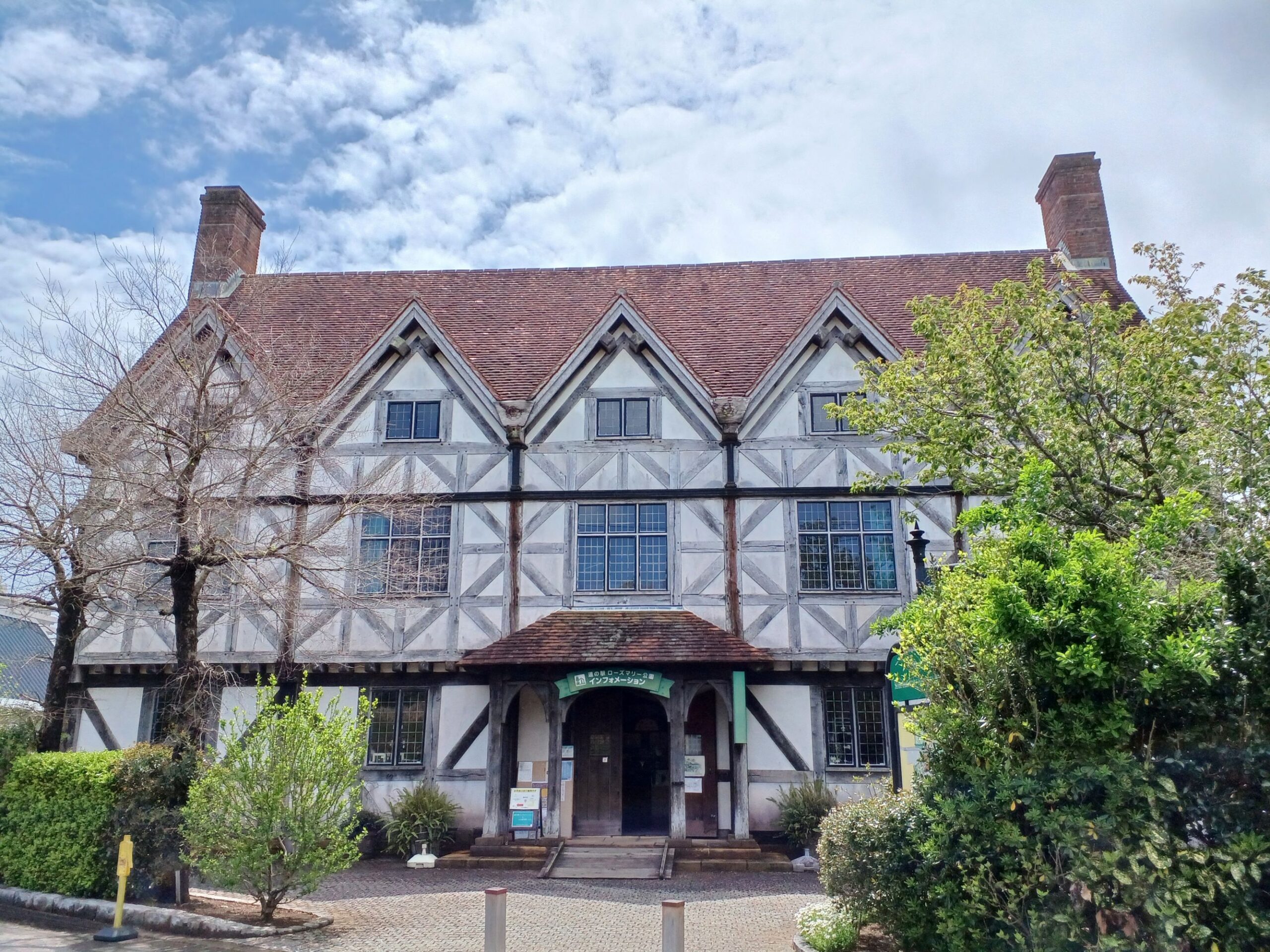 地内にある「インフォメーション」は、文豪シェイクスピアが晩年を過ごした家を再現した中世ヨーロッパ調の建物が特徴。1階には雑貨店、2階は展示室になっています。
