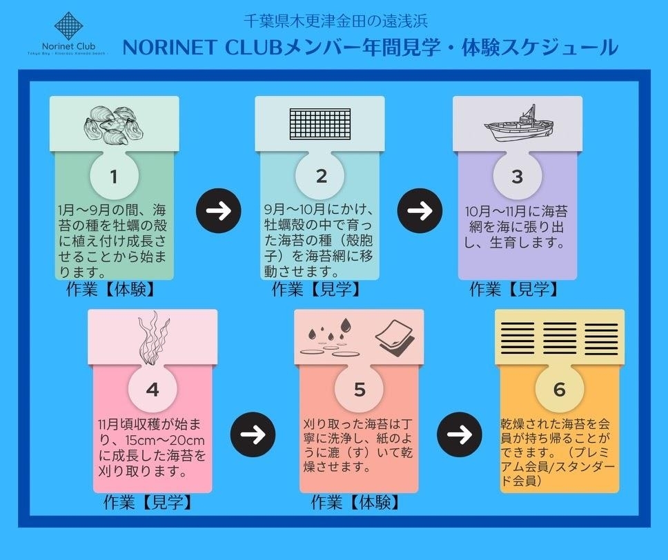 Norinet Clubでは「東京湾の海を知る体験」を【海苔漁】を通じて提供している。海苔漁は種付け作業から収穫まで年間を通じて海と関わるため、参加することで季節により変化する海と生物との関係性を体感し、元々の知識に加え経験が合わせられることでお子さんにとっては「生きた知識」となり、大人にとってもこれからの人生の「知識の基準点」の一つとなる。