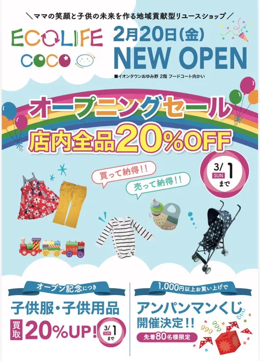 【千葉市緑区】子供服リユースショップECOLIFE COCO・イオンタウンおゆみ野に2月20日オープン/オープニングイベント情報も