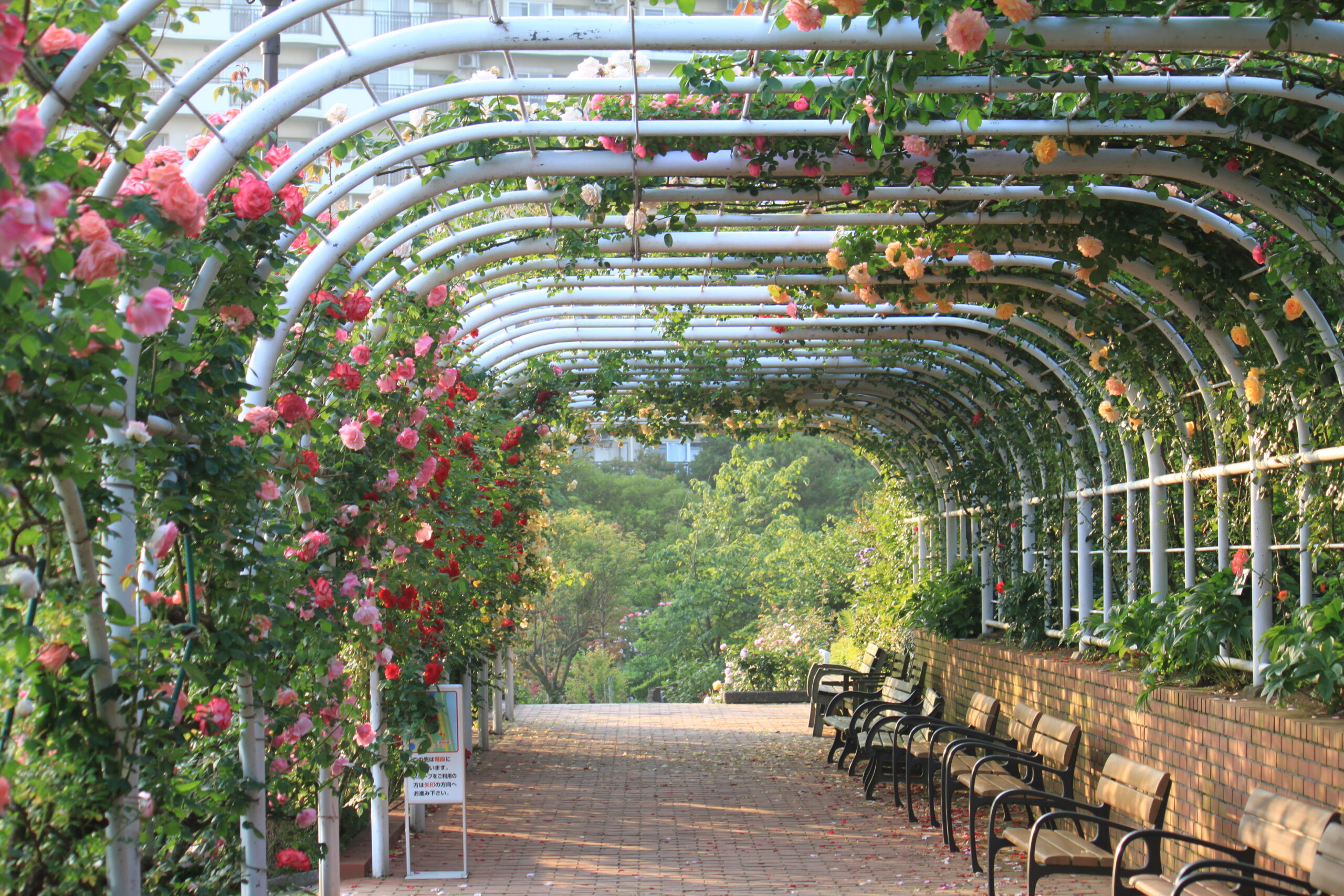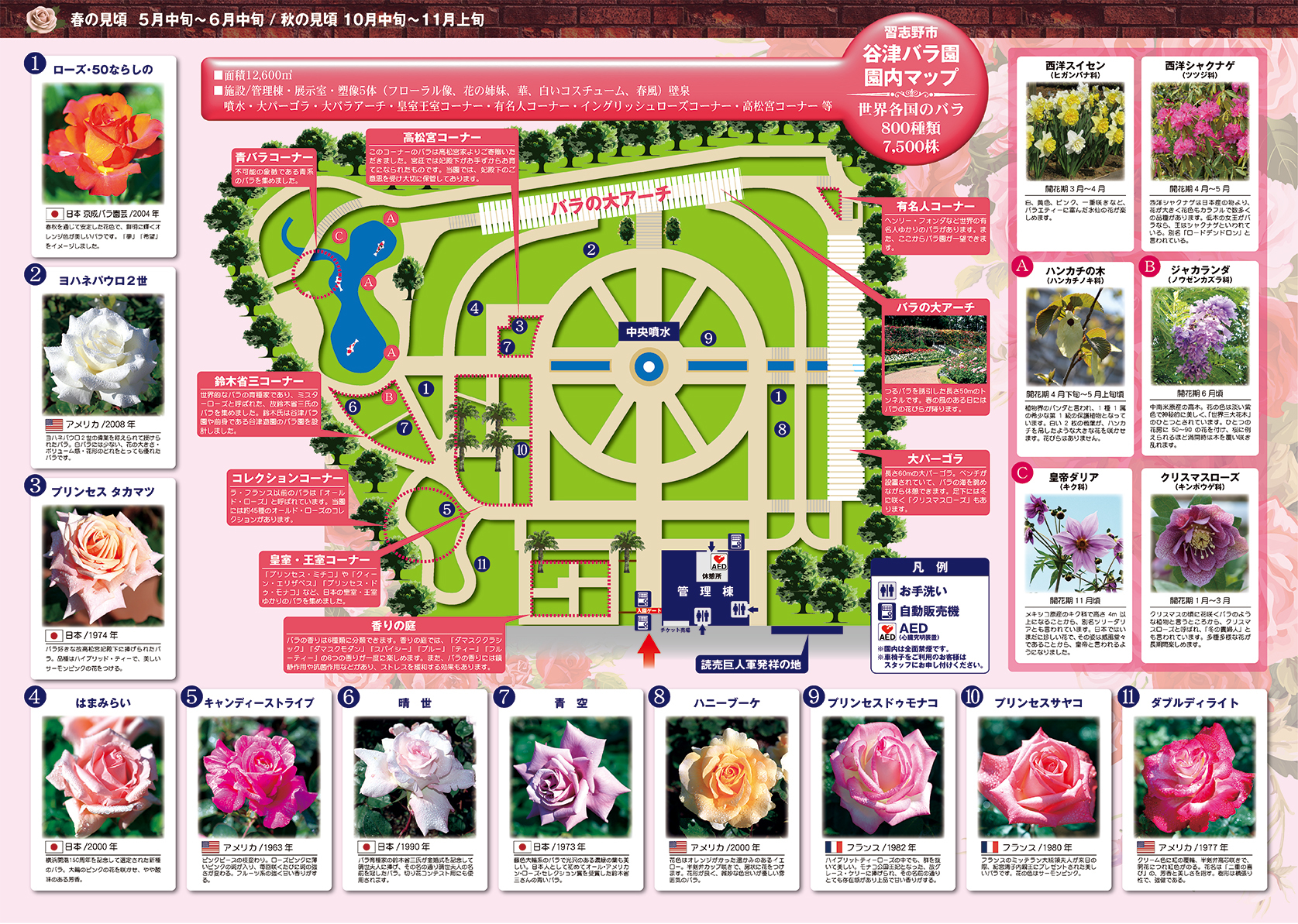 園内には、長さ60mのバラのトンネルやイングリッシュローズコーナー、世界各国の皇室・王室にちなんだ品種、珍しい原種などを集めた各種コーナー、「香りの庭」などがあり、訪れる人々を魅了します。