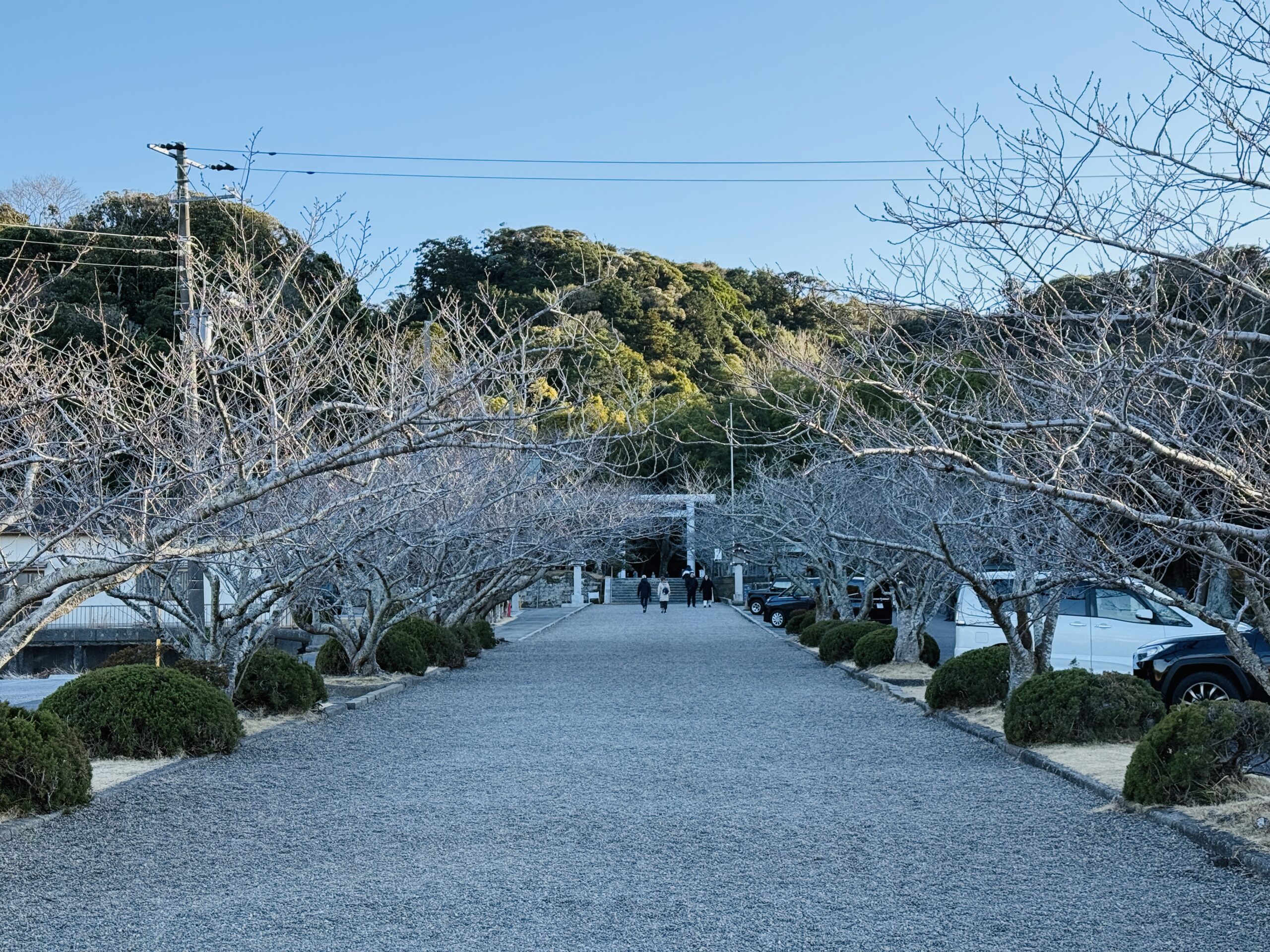 長い参道沿いには約200本のソメイヨシノが並び、春には桜のトンネルとなる華やかな景観が訪れる人々を魅了します。緑深い森に囲まれた境内は、一歩一歩が心を落ち着かせる散策路でもあります。