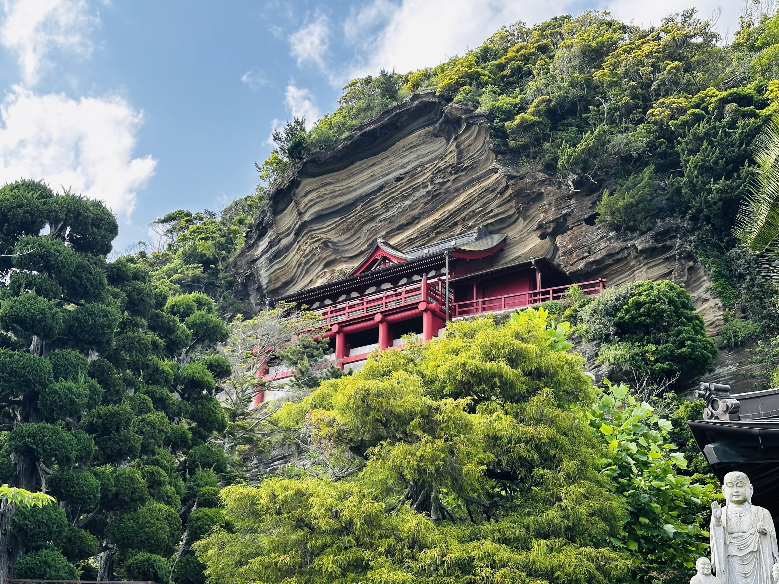 千葉県館山市船形に位置する 大福寺(通称 崖観音) は、717年に行基が崖に磨崖十一面観音を刻んだことに始まり、真言宗智山派の寺院です。その赤い観音堂は船形山の中腹に絶壁のように張り付き、崖観音として親しまれています。 現在の観音堂は大正14年(1925年)に再建され、近年耐震改修や塗り替えが行われました。境内まで続く階段を登ると、堂内の自然石に彫られた本尊や、南房総の海と富士山、伊豆大島を望む絶景が楽しめます。 断崖に建つ朱塗りの観音堂と歴史ある磨崖仏、そして眼下に広がる館山湾の風景―大福寺は、自然・歴史・信仰が融合した圧巻の名所です。