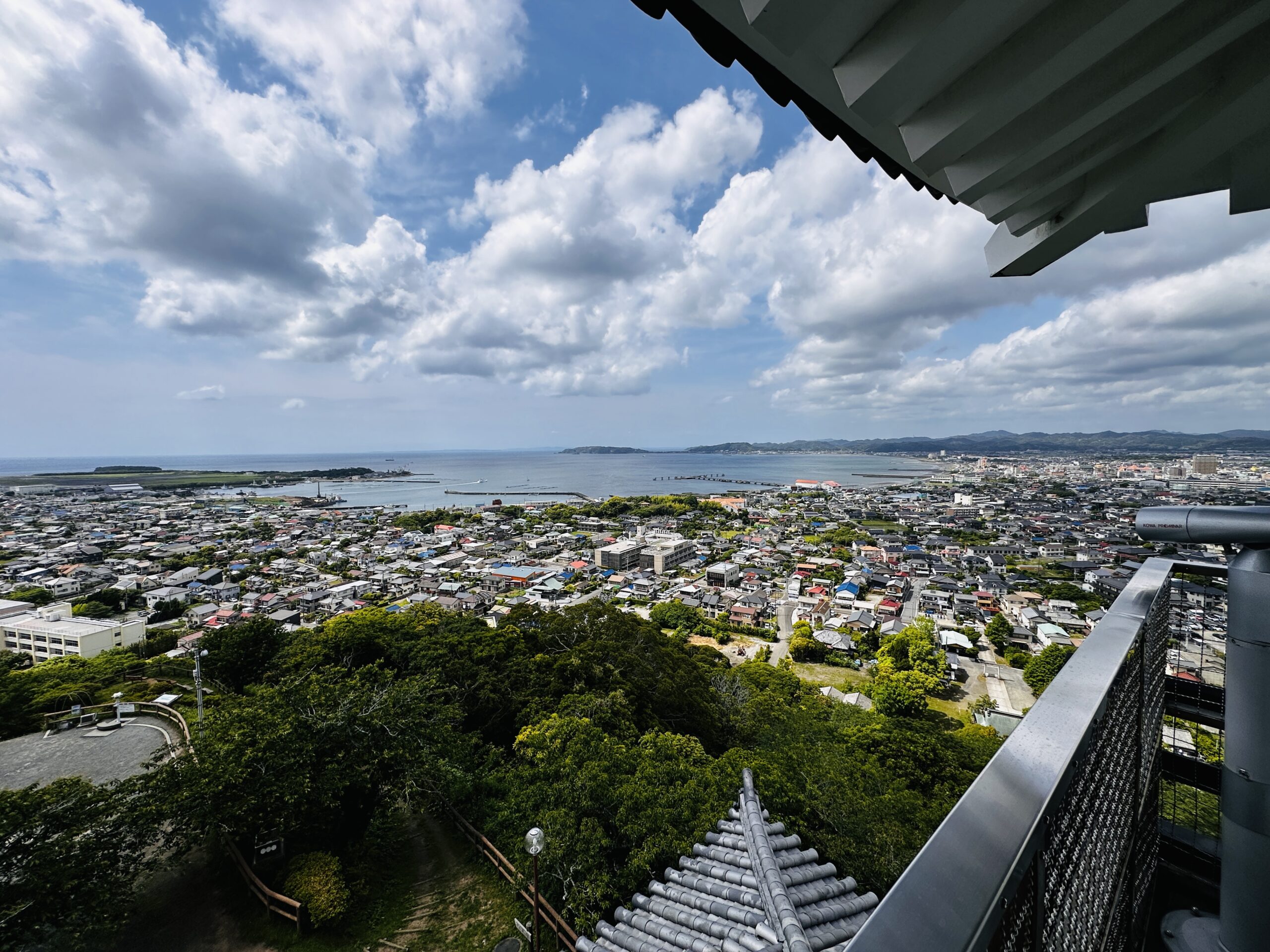 天守閣最上階の展望台からは、太平洋に注ぐ館山湾や三浦半島、天気が良ければ富士山も望めます。春には桜やツツジ、椿など季節の花に包まれた散歩道も魅力です。