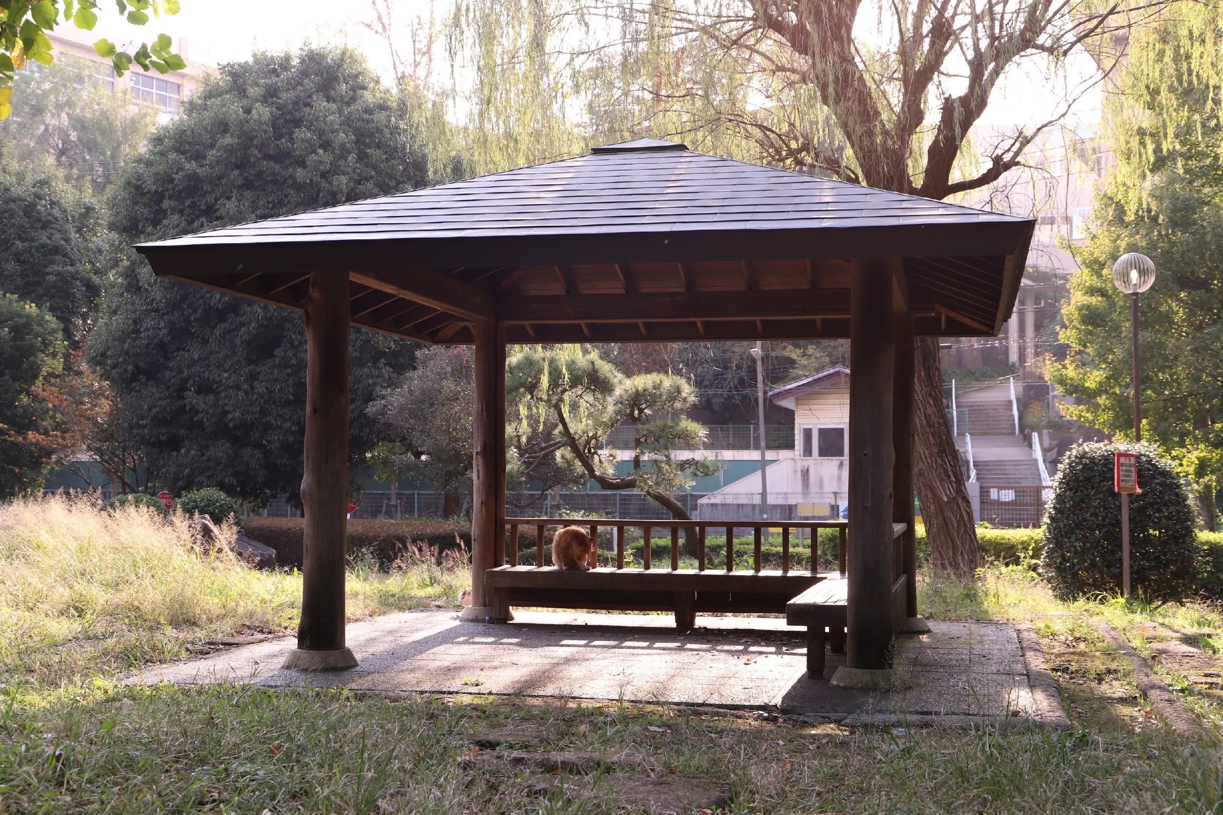 春には約130本の紅白の梅が咲き誇り、梅林としても知られています。夏にはツツジ、秋にはキンモクセイの香りと紅葉、冬には鴨などの渡り鳥が飛来し、一年を通じて自然の移ろいを感じられます。園内には茶室「登龍庵」があり、予約制で茶会などに利用できます。