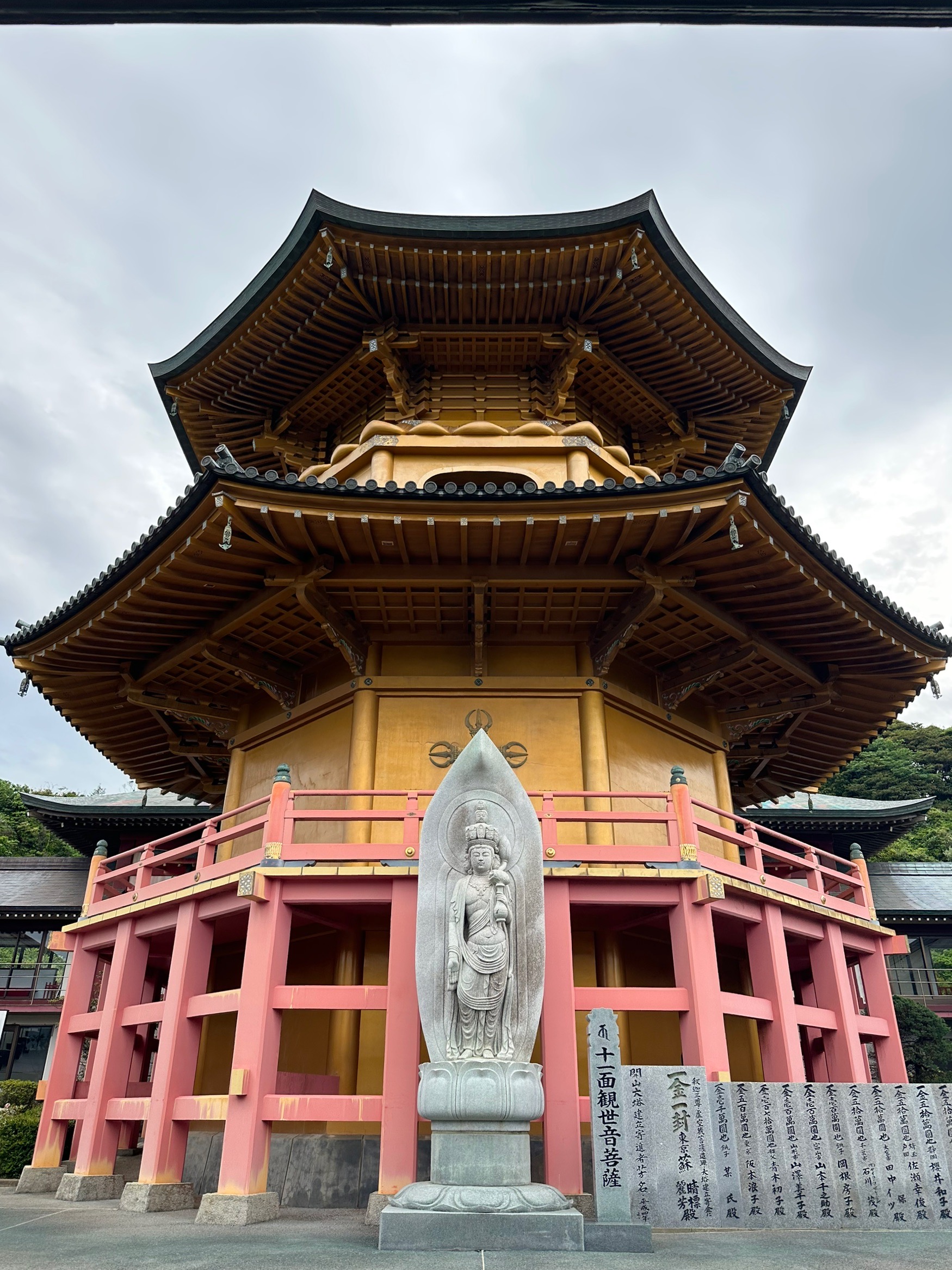 境内中央にそびえる金色の多層大塔は、海に向かって大きく開かれた構えが特徴です。上層からは太平洋が一望でき、ピーカンの日には白亜の波が水平線にきらめきます。