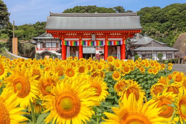 冬から春(12~3月)にかけて約6,000本の椿が一斉に開花し、境内は色とりどりの花々に包まれます。また近年、山門前にはひまわり畑も登場し、季節外れの花景色も楽しめるようになりました。