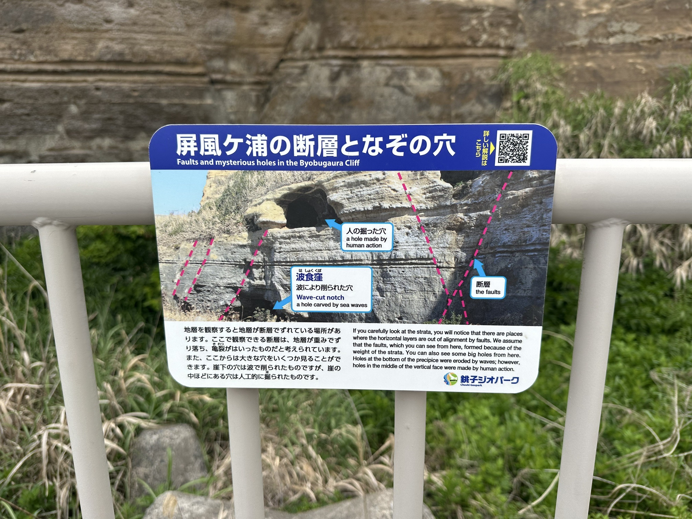 断崖を構成する地層は新第三紀鮮新世から第四紀更新世(約300万~40万年前)に亘り堆積した犬吠層群、その上に香取層や関東ローム層が不整合に重なる複雑な構造で、隆起や侵食の歴史がそのまま読み取れます。