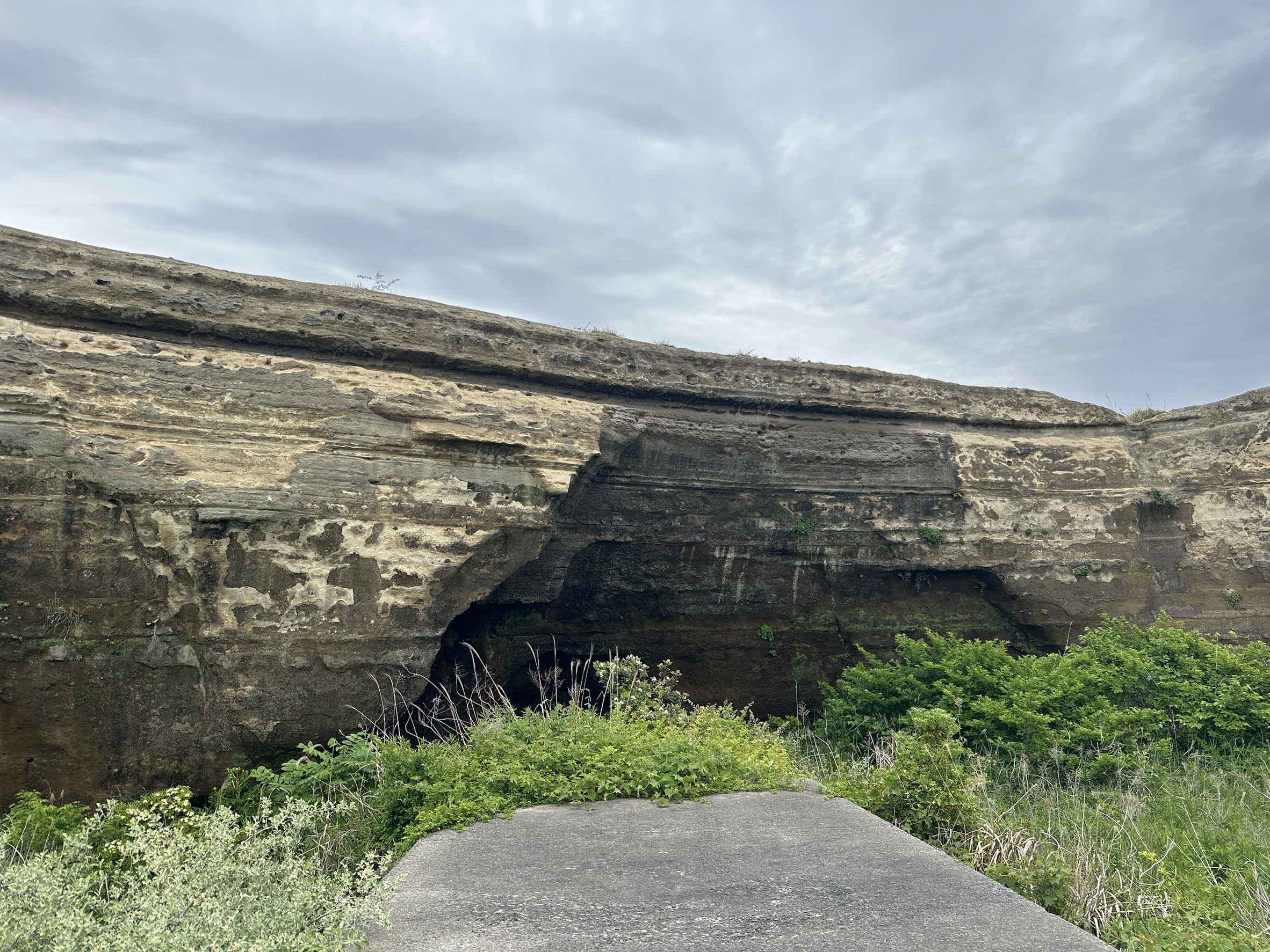 崖の岩質は軟らかく波の作用で年約1m後退を続けており、1960年代以降の消波ブロック設置など人為的な侵食対策により、その速度は抑えられていますが、未だに侵食は進行中です。