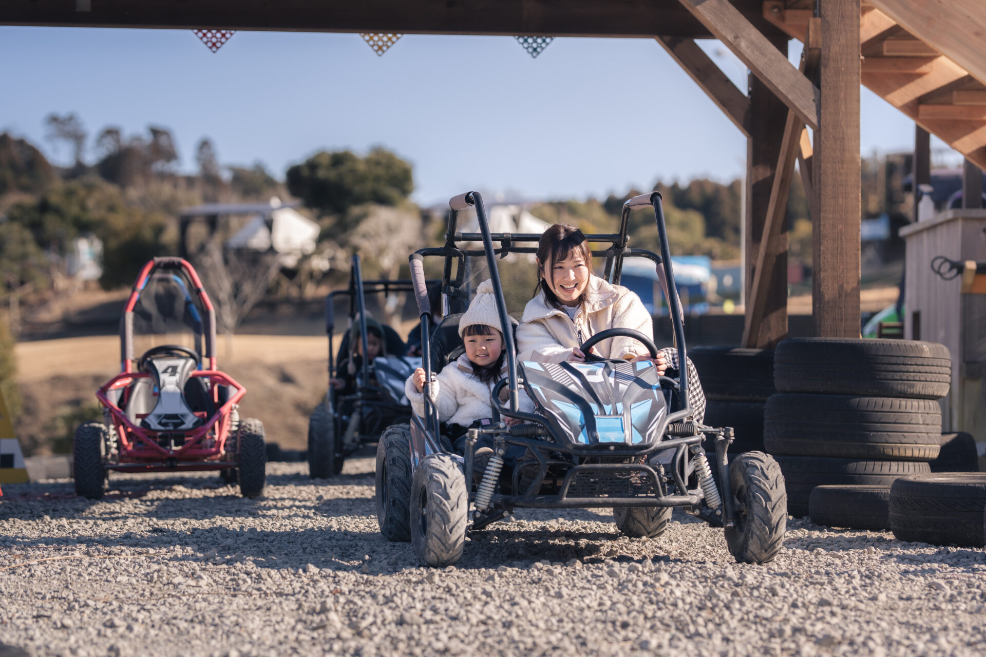 青空の下、木々の間をぐんぐん走り抜ける、バギーカート。その爽快感は、まるで森の中の冒険に出かけたような気分にさせてくれます。