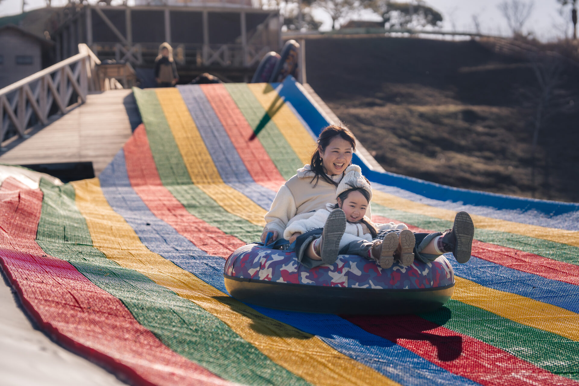 風を切るスピード感と、高低差によるスリルはまさに非日常。最初はドキドキしていた子どもたちも、ひとたび滑れば笑顔が止まらず、「もう1回!」の声が続出です。