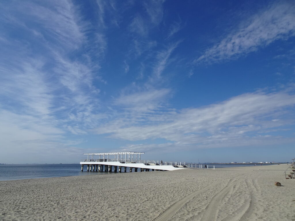 稲毛海浜公園には海へと延びる「白いウッドデッキ」があります。稲毛海浜公園のシンボルとなっている、この素敵なウッドデッキは2022年4月下旬に設置されオープンしました。ずっと前からあるような気がしますが、まだできて3年の新しい桟橋なのですね。