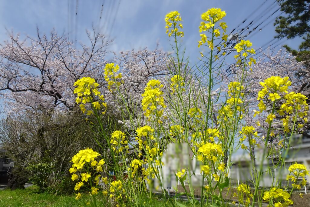 菜の花やパンジーなど桜と同時に咲く花もあり、とてもきれいです。これからは桜が散る日へと変化していきますが、散る桜も風情があって良いものです。車が通る道なので、歩きながら桜を見る時には気をつけて楽しんでくださいね。