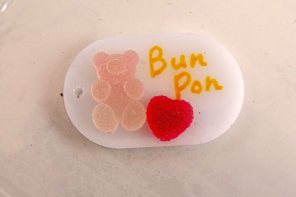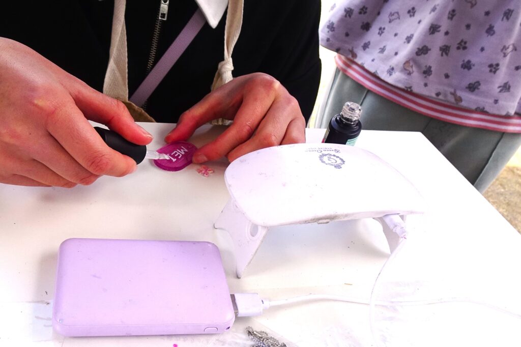 自分のキーホルダーの形が決まったら、レジンをぬってもらいます。そしてライトを当ててレジンを固めたらできあがり!軽くて名前もしっかり入ったキーホルダーができあがります。