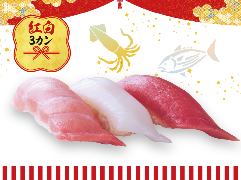 1年の始まりにふさわしい紅白の握り。本まぐろ大とろ、いか、本まぐろ上赤身の3カンで、食感の違いも味わえる!(下画像)