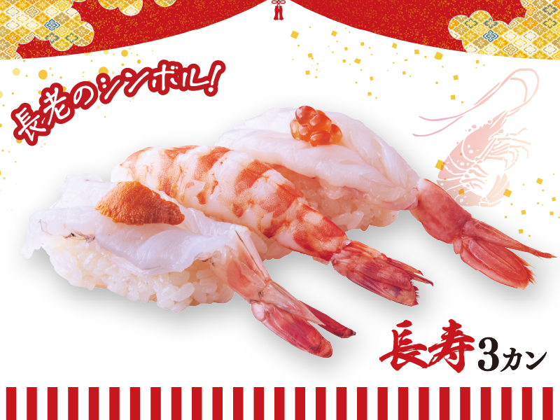 長いひげ、丸い背中から「長寿」を願う縁起物とされる海老を、3種盛に! 素材はフラワー海老、車海老、赤海老で、コスパのよさも光る!(下画像)