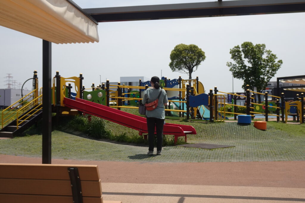 開閉式の日よけがあるベンチです。日差しの強い日は、日陰で休みながら子どもが遊ぶのを見たり、自分も休憩をいれながら遊んだりできるのは良いですね。