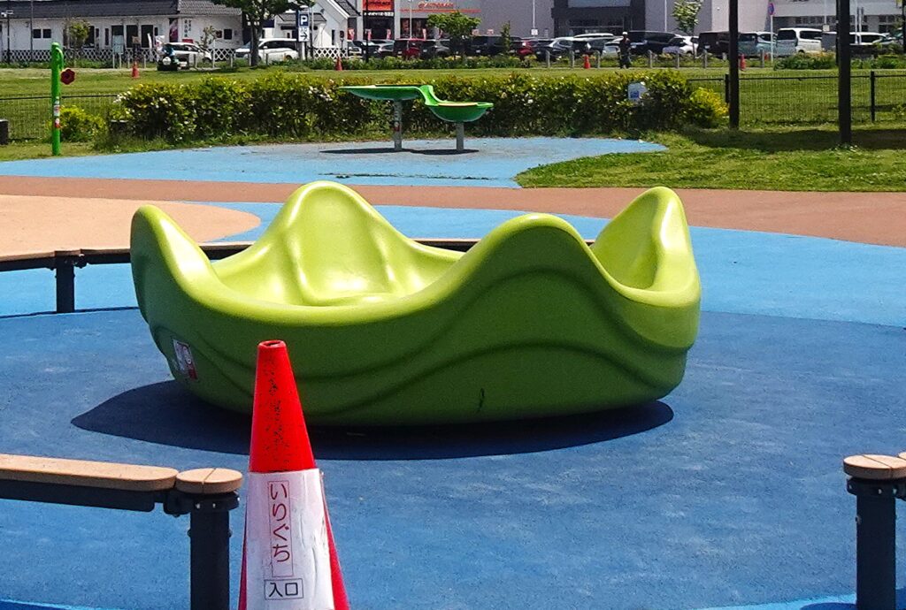 こちらも複数人で遊べる遊具です。背もたれが高く、寝そべることもできます。自由な体勢で、回転する感覚も楽しみながら遊べるのも魅力です。