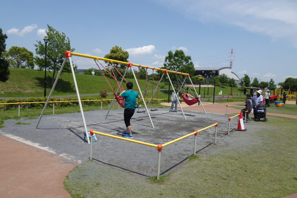 このブランコはお皿のようなくぼみのある形をしています。4人まで乗って遊べるブランコです。姿勢保持の難しいお子さまでも寝そべって乗ることができるブランコです。説明の看板も設置されているので、初めての場合はよく読んで乗ってみると良いですね。